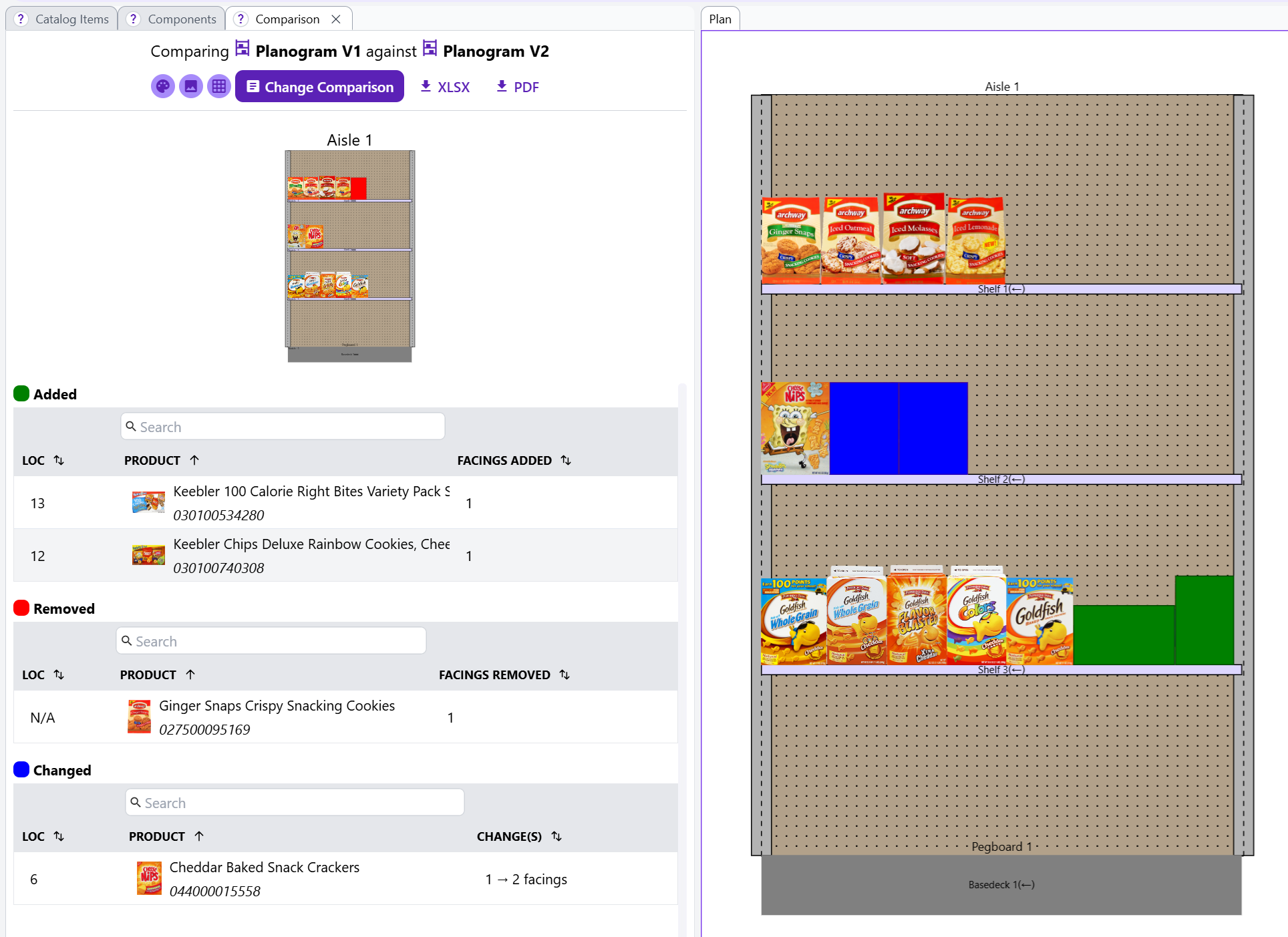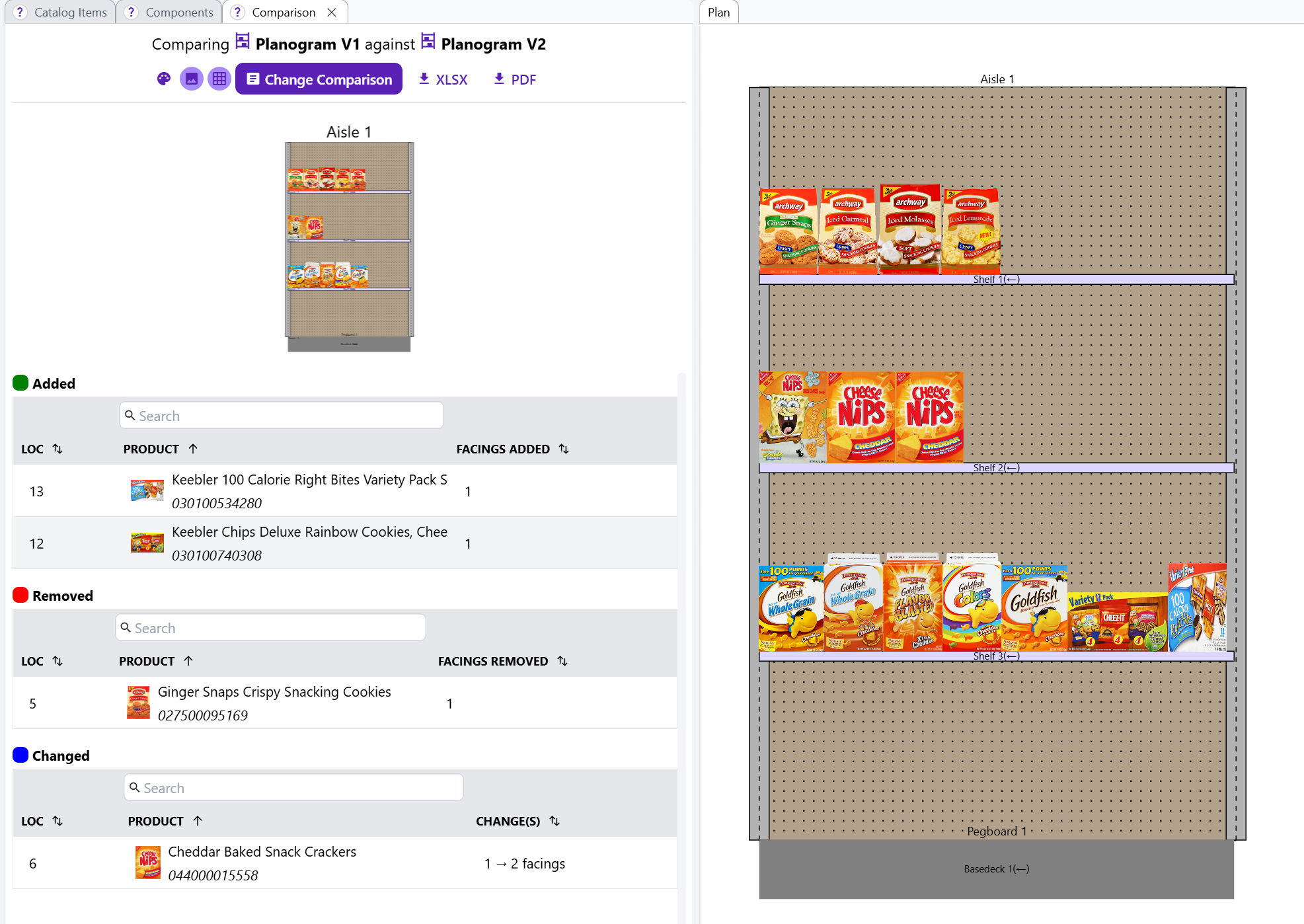 compare Comparisons allow you to compare the contents of your currently open Planogram with another planogram, viewing added, removed, and changed Positions.