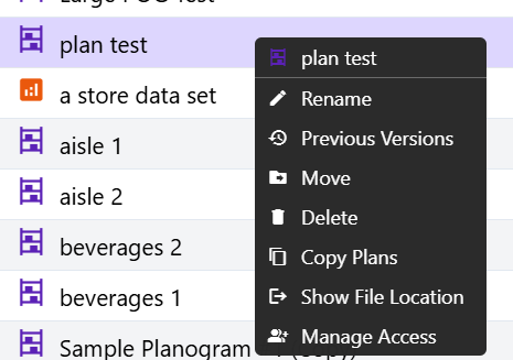 The Filesystem is where your work is saved to. It contains article Files (such as Plans, shopping_basket Assortments, and analyticsStore Data Sets), and folder Folders, which are used to organize Files.