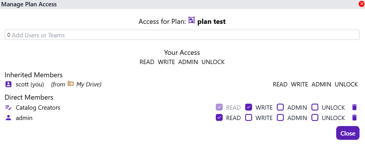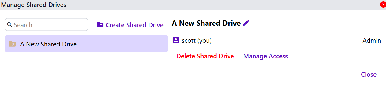 Clicking Manage Access opens the Access Management dialog, where one may specify which Users and Teams can access the drive, as well as their permission levels.