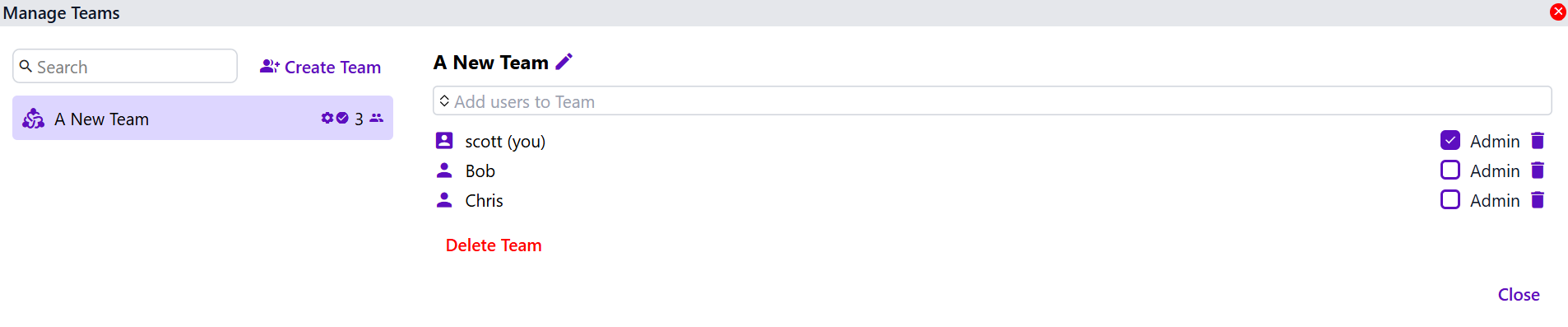 Click the delete button to remove a User from the Team.