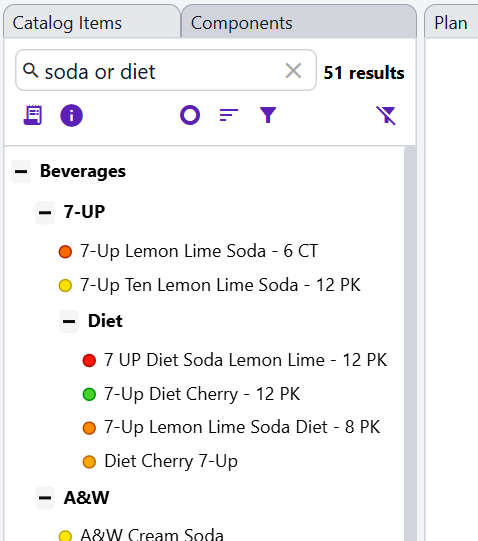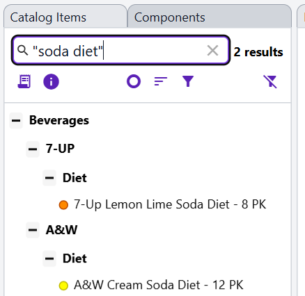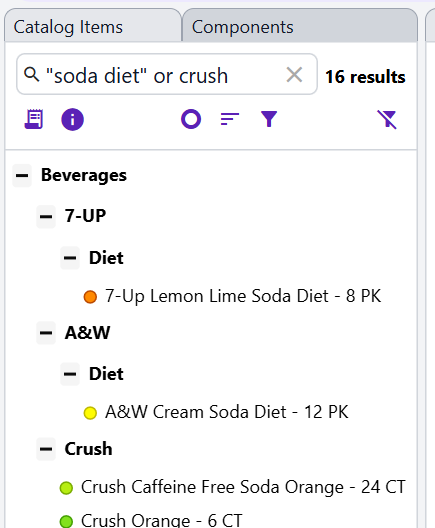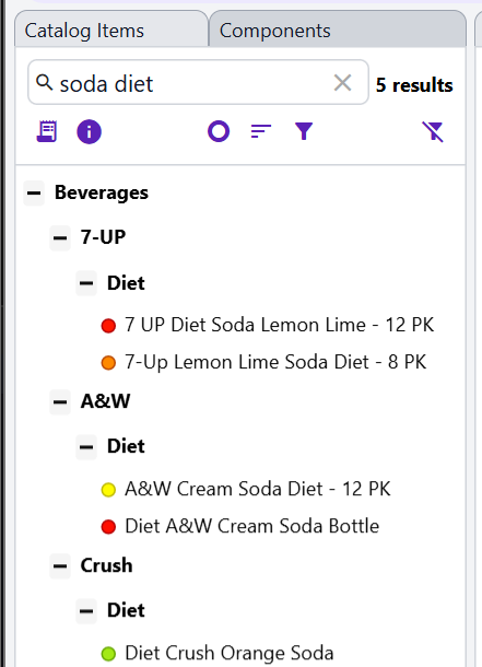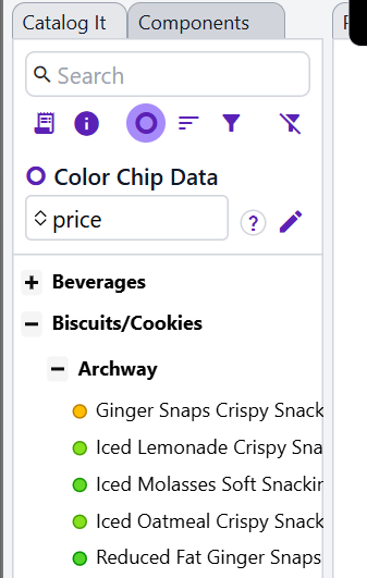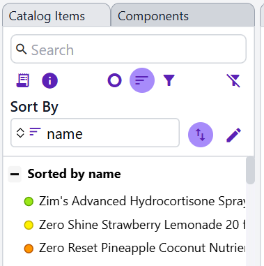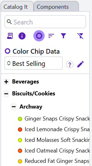 You may notice a colored circle to the left of catalog items. This is known as a catalog color chip.