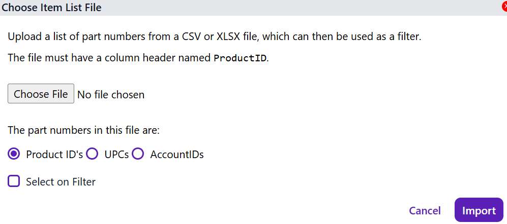 The file we upload must have the header ProductID above the column that has the part numbers to use for the assortment.