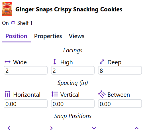 By default, Positions are arranged with 0 spacing between facings. Adjusting the Spacing inputs in the Inspector, using a layout, or adding Position(s) to a Shelf with an auto-Alignment property will arrange its facing columns accordingly.
