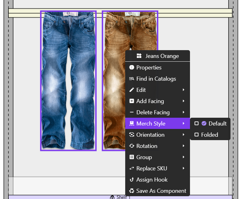 To change a product's merchandising style, right click on it, then select Merchandising Style from the context menu. This will open a sub-menu containing all possible merchandising styles for that item