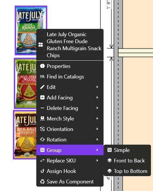 Products may also be Rotated 90 or -90 degrees (turned on their side), regardless of current orientation. To rotate a product, right click on it, then select a Rotate 90 option. Clicking this option again will reset rotation.