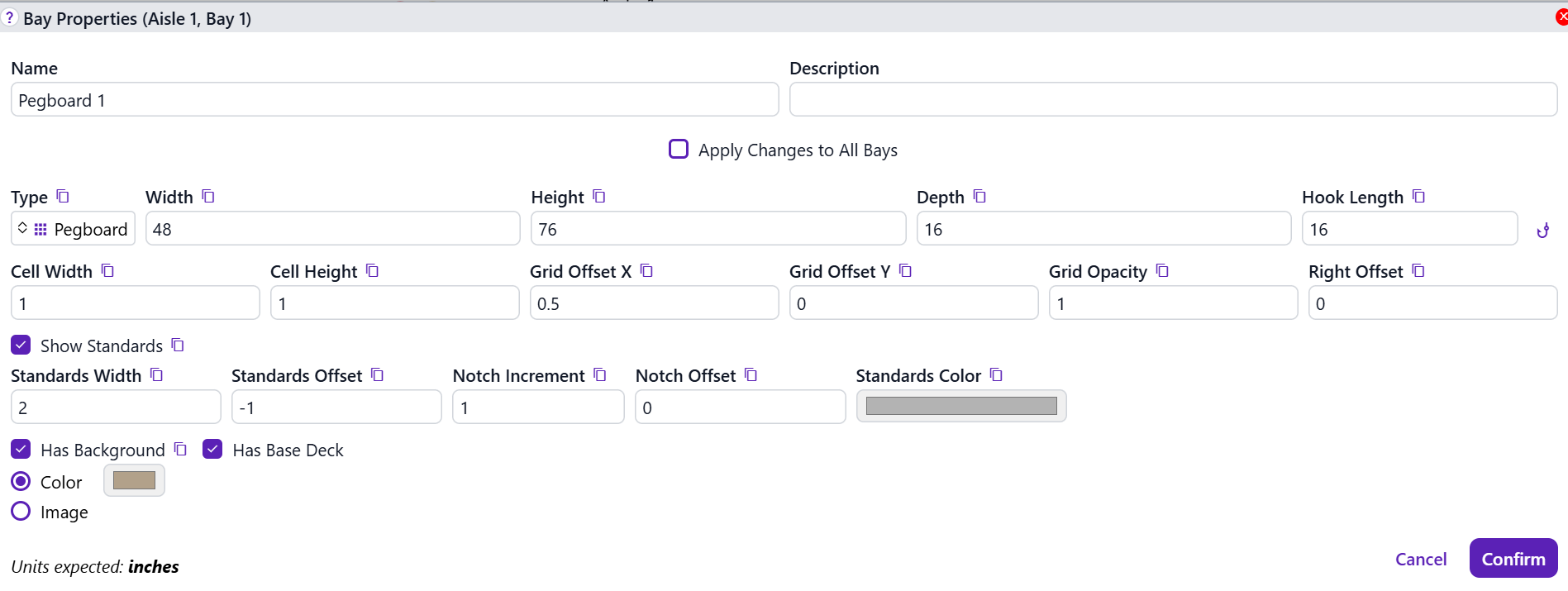 When editing a Rack's properties, if it is a Bay, you can use the content_copy checkbox buttons beside inputs to update those properties for all Bays in the Aisle. If you want all changes to be applied to all Aisle Bays, check the Apply Changes to All Bays checkbox.
