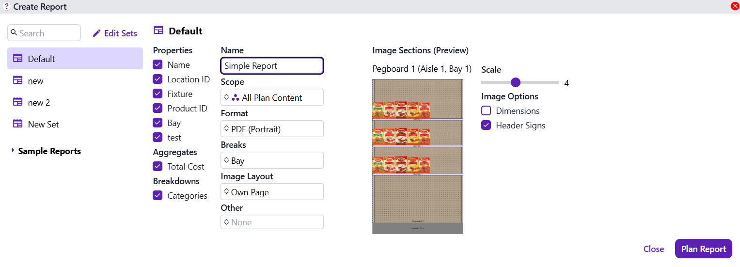 For PDF reports, Breaks specifies whether separate report pages will be generated for each Aisle or Bay.